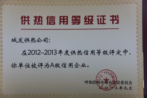 年度供熱信用等級評定中,呼市城發(fā)供熱有限責任公司被評為