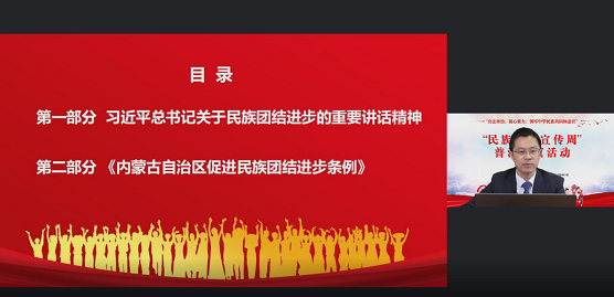 本次培訓(xùn)以良法善治,凝心聚力,鑄牢中華民族共同體意識(shí)為主題,中國政法大學(xué)劉東剛博士圍繞習(xí)近平總書記關(guān)于民族團(tuán)結(jié)進(jìn)步的重要講話指示精神、《中國共產(chǎn)黨統(tǒng)一戰(zhàn)線工作條例》《內(nèi)蒙古自治區(qū)促進(jìn)民族團(tuán)結(jié)進(jìn)步條例》《中華人民共和國國家通用語言文字法》《內(nèi)蒙古自治區(qū)實(shí)施〈中華人民共和國國家通用語言文字法〉辦法》《民族區(qū)域自治法》《城市民族工作條例》的重點(diǎn)亮點(diǎn)內(nèi)容進(jìn)行了解讀。