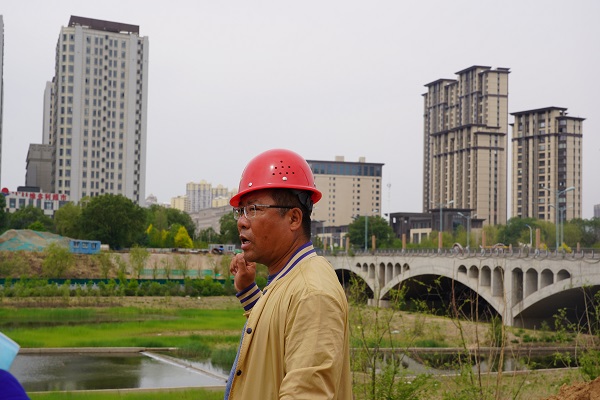 筆者來到成吉思汗大街與哈拉沁路交匯處的路口,遠(yuǎn)遠(yuǎn)就看見一臺(tái)重型吊車矗立在工地圍擋中,圍擋內(nèi)就是跨越東河頂管工程的施工現(xiàn)場(chǎng)。