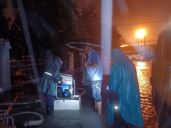 橋靠分公司組織員工們先將防汛沙袋置于地勢較低的單元門口,將水泵置于地勢最低處做好了防汛排水的準(zhǔn)備工作。為了確保人民群眾的生命財產(chǎn)安全,在做好前期準(zhǔn)備工作后,大家便守在現(xiàn)場,密切關(guān)注天氣情況,實時監(jiān)測雨情汛情,雖然白天的天空還能看到藍(lán)天白云,但他們堅守崗位絲毫不敢松懈,只是買了盒飯靠在車旁簡單的解決了溫飽。13日夜間22時,隨著雨量的加大及降雨的持續(xù),小區(qū)內(nèi)地勢低洼處排水量開始小于降水量,積水深度開始上漲。此時天空就像是開啟了“水簾洞”模式,穿著雨衣依舊全身濕透的防汛職工們冒著雨淌著水一遍遍的查看,按照防汛作業(yè)預(yù)案開展工作,他們始終堅守一線在暴雨中逆行,全力以赴守護(hù)轄區(qū)群眾安危。