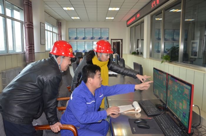 城發(fā)公司董事長張瑞平在橋靠司爐車間給環(huán)保局領導講解脫硫情況