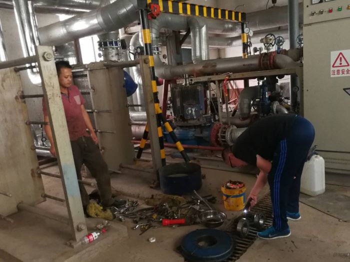第一站為運(yùn)營二所儲運(yùn)熱力站,站內(nèi)一派忙碌的檢修景象,檢修人員正在拆解75KW循環(huán)泵。據(jù)運(yùn)營二所檢修助理尚帥介紹,此臺循環(huán)泵于2005年投入使用,運(yùn)行期間,可供儲運(yùn)小區(qū)、會計(jì)學(xué)校、煤炭大廈、以及中華家園一期等居民用熱。在拆解過程中發(fā)現(xiàn)循環(huán)泵電機(jī)線包有燒焦處并且發(fā)黑,電機(jī)端蓋也磨損嚴(yán)重。副經(jīng)理劉強(qiáng)仔細(xì)查看,囑咐二所人員針對老、舊設(shè)備工況應(yīng)及時(shí)采購更換以保證冬季采暖期熱用戶的用熱保障。隨后,前往運(yùn)營三所恒大G區(qū)熱力站進(jìn)行安全檢查,站內(nèi)檢修人員正在清洗除污器。