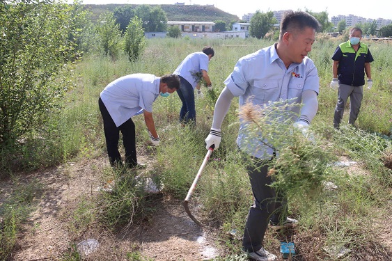 活動(dòng)現(xiàn)場(chǎng),黨支部書(shū)記娜仁、經(jīng)理史濤帶領(lǐng)大家在各自的責(zé)任區(qū)域內(nèi)分片作業(yè)。大家在炎炎烈日下,揮汗如雨、干勁十足,有的拔除蒿草、有的收集清運(yùn)……經(jīng)過(guò)一下午地辛勤作業(yè),小區(qū)及周邊的蒿草不見(jiàn)了,空氣清新了,環(huán)境也變美了。